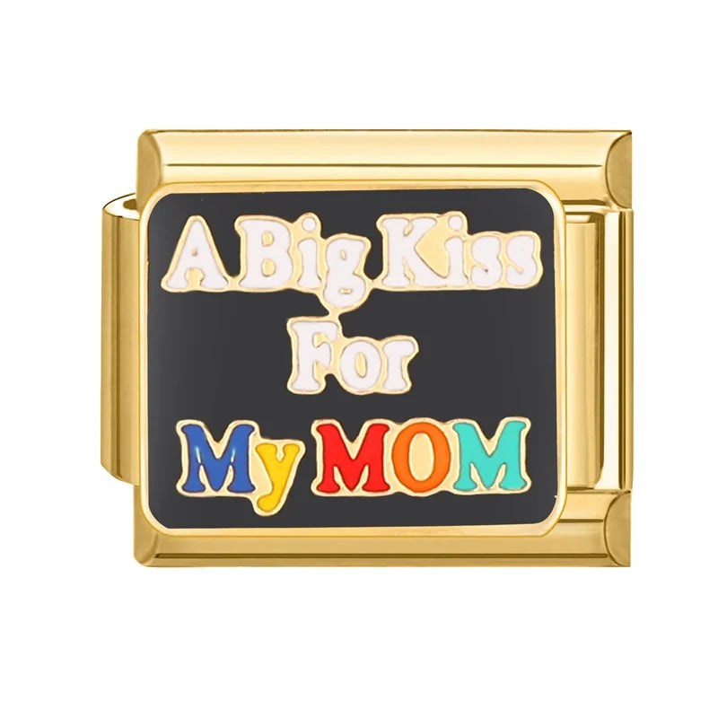 "Charm" z nerezové oceli ve zlaté barvě s nápisem A big kiss for My Mom.