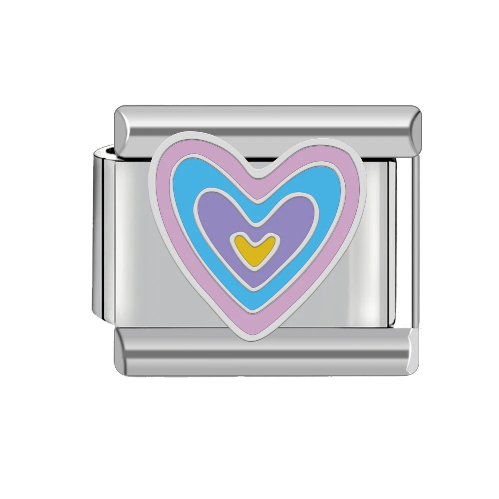 Stříbrný "Charm" z nerezové oceli s fialovo-modrým srdcem.