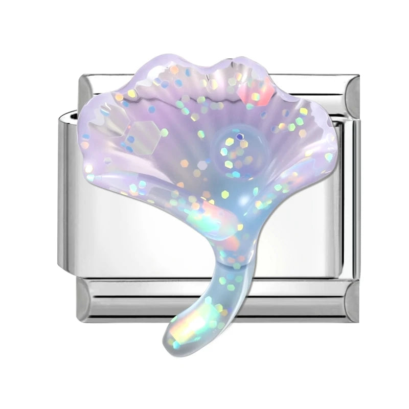 Stříbrný "Charm" z nerezové oceli s květinou v holografické barvě.