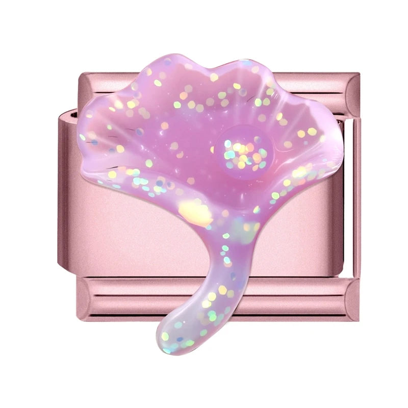 Růžový "Charm" z nerezové oceli s holografickou růžovou květinou.