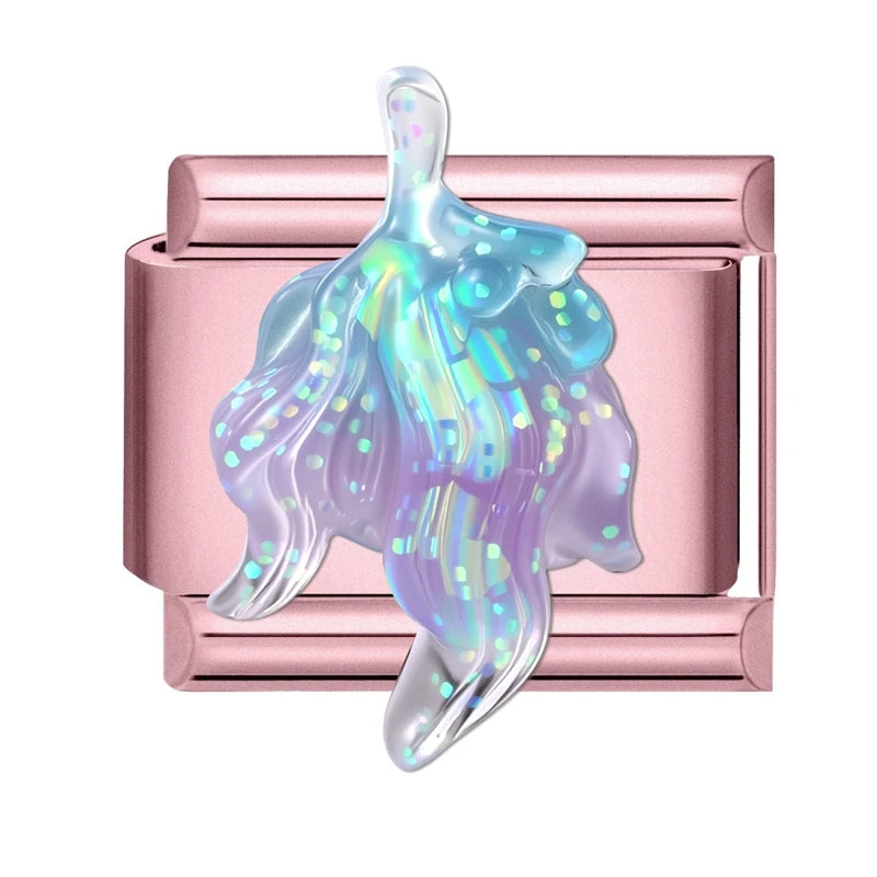 Růžový "Charm" z nerezové oceli s rostlinou v holografické barvě.