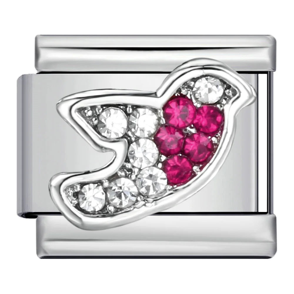 Stříbrný "Charm" z nerezové oceli s holubem s růžovými gemy.