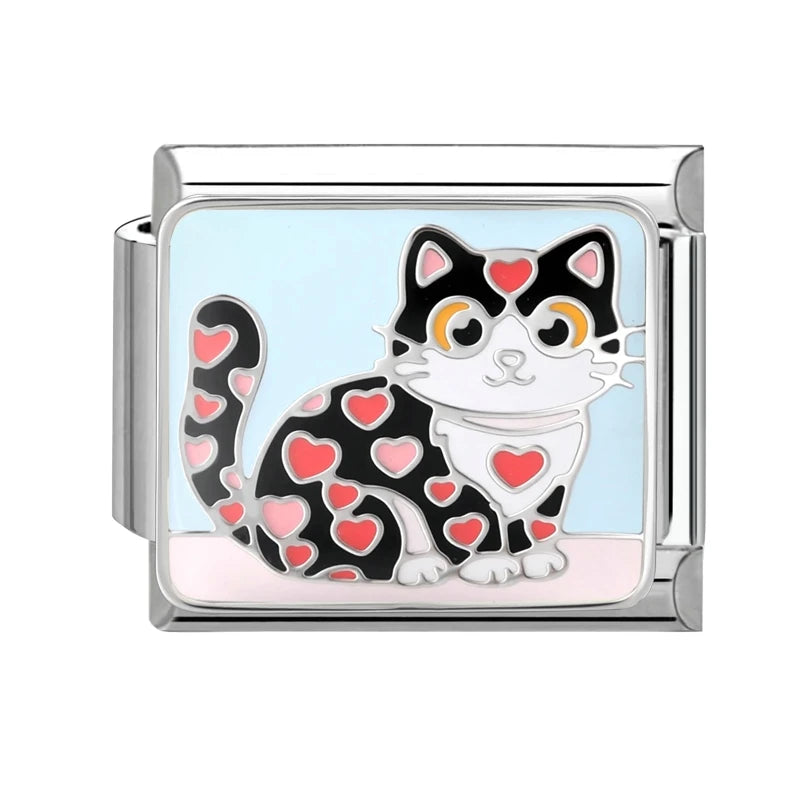 Stříbrný "Charm" z nerezové oceli s kočkou se srdíčky.
