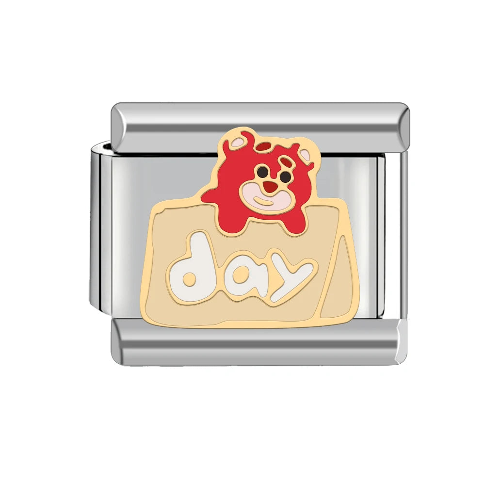Stříbrný "Charm" z nerezové oceli s medvídkem na kalendáři s nápisem Day.