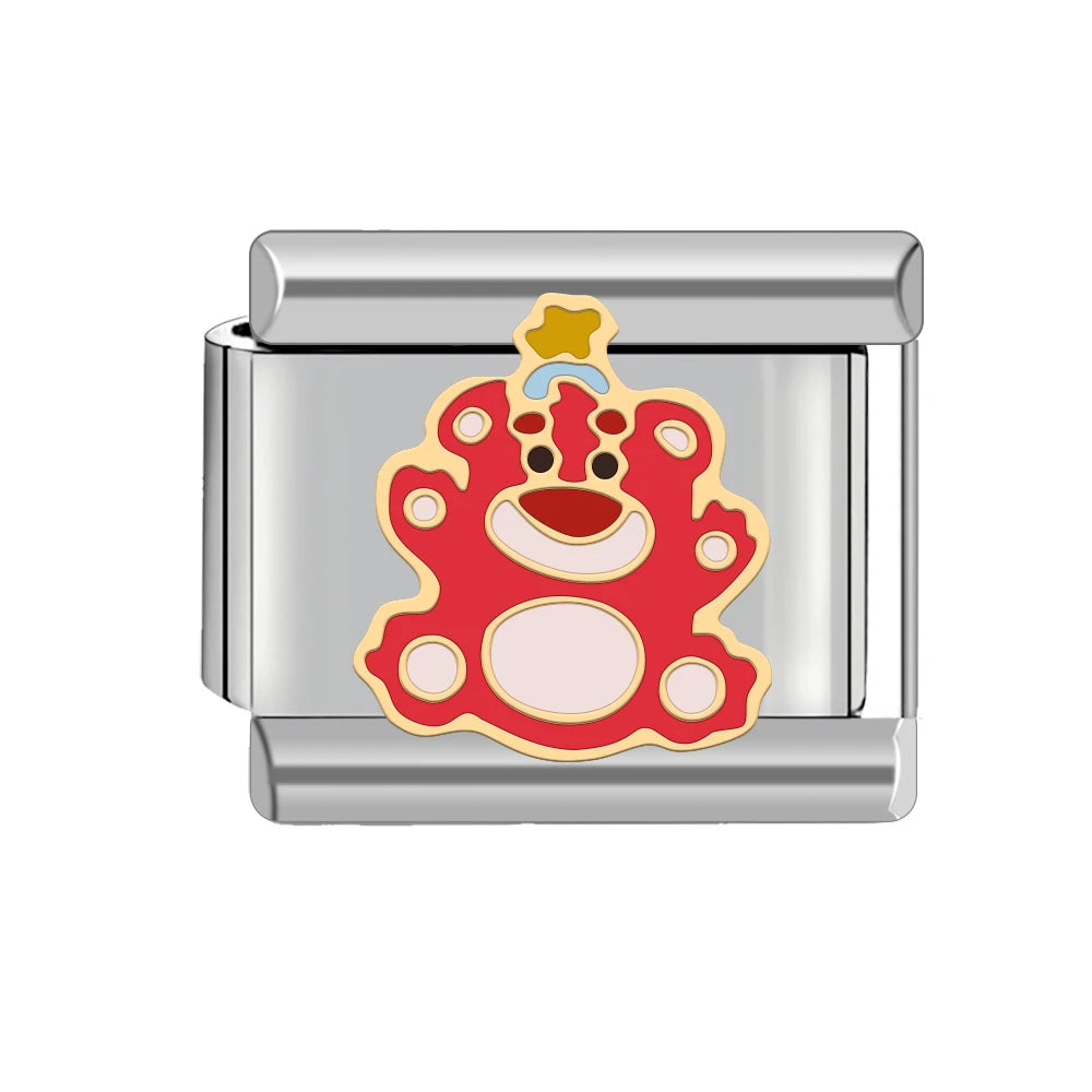Stříbrný "Charm" z nerezové oceli s medvídkem v červené barvě s čelenkou.