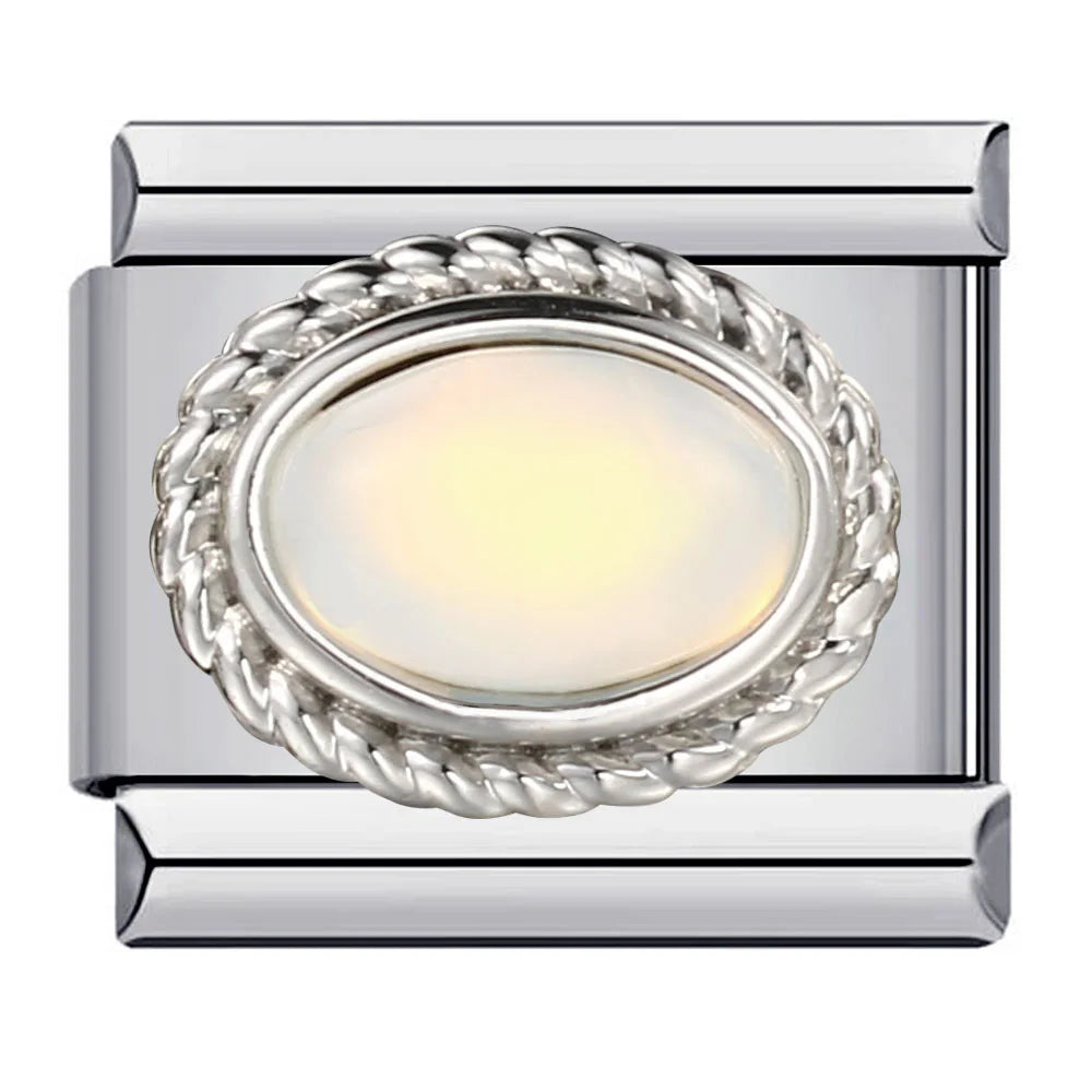Stříbrný "Charm" z nerezové oceli s milky gemem.