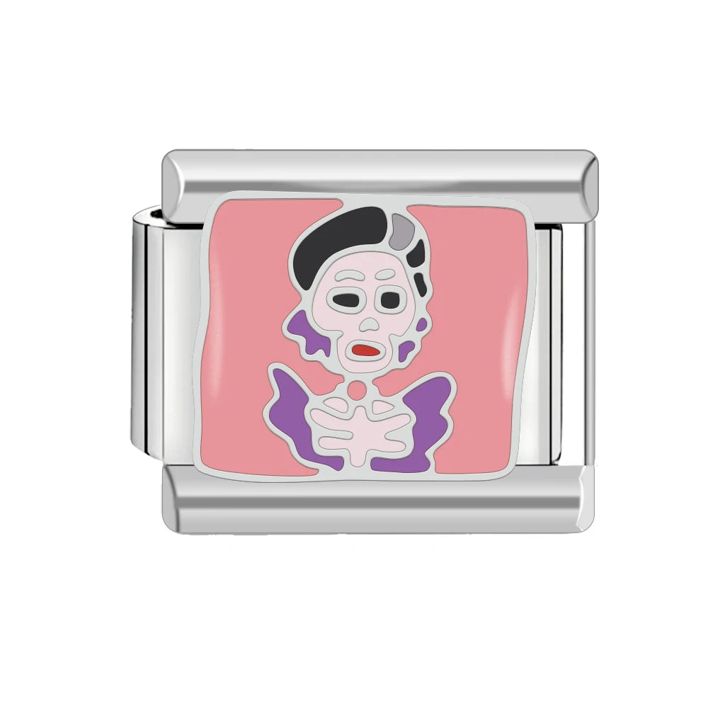 Stříbrný "Charm" z nerezové oceli s moderní Catrinou na růžovém podkladu.