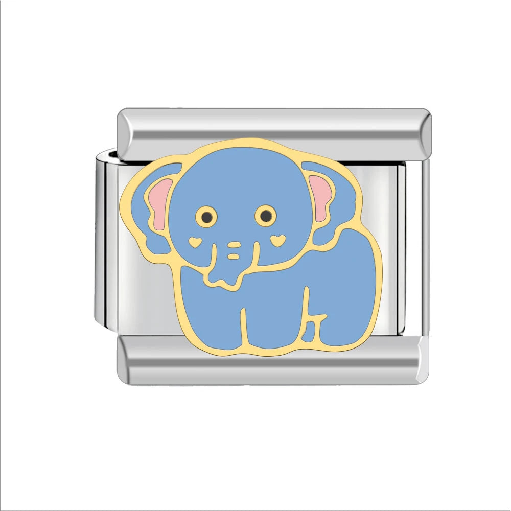 Stříbrný "Charm" z nerezové oceli s modrým slonem se zlatým obrysem.