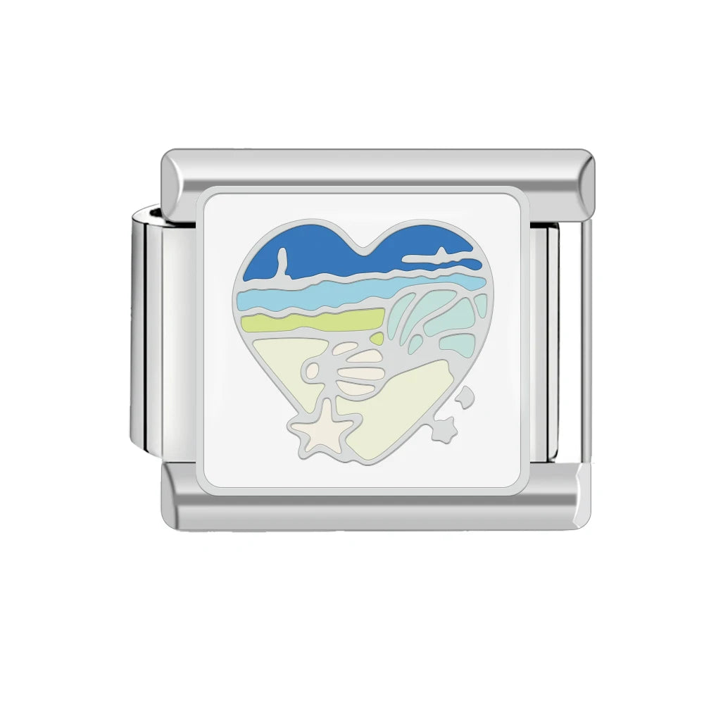 Stříbrný "Charm" z nerezové oceli s mušlí a výhledem na moře v srdci na bílém podkladu.