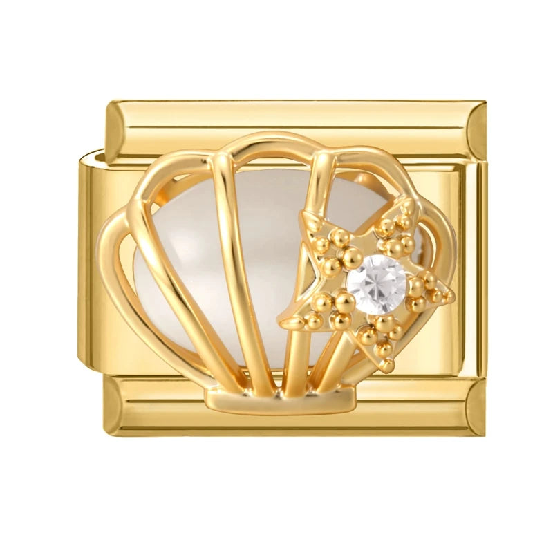 Zlatý "Charm" z nerezové oceli s mušlí, hvězdou a gemem.