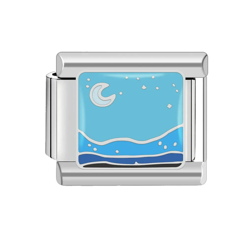 Stříbrný "Charm" z nerezové oceli s noční oblohou u moře.