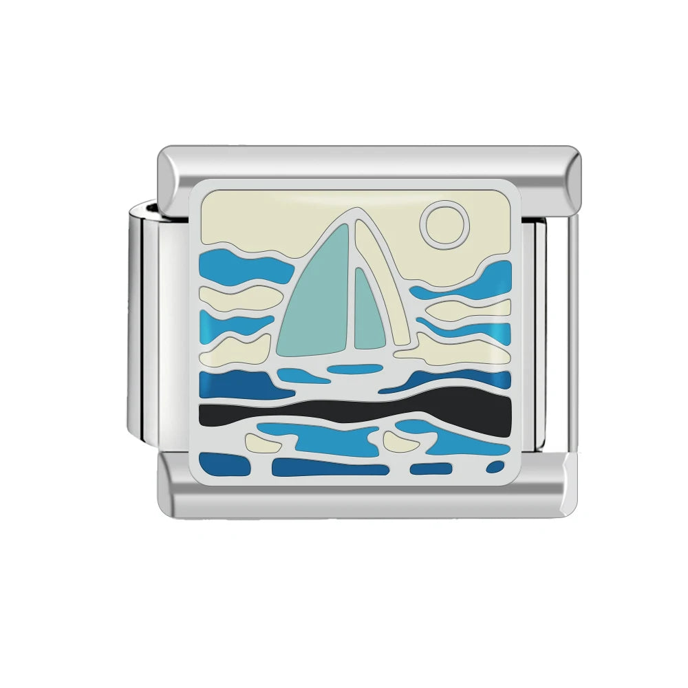 Stříbrný "Charm" z nerezové oceli s plachetnicí na moři.