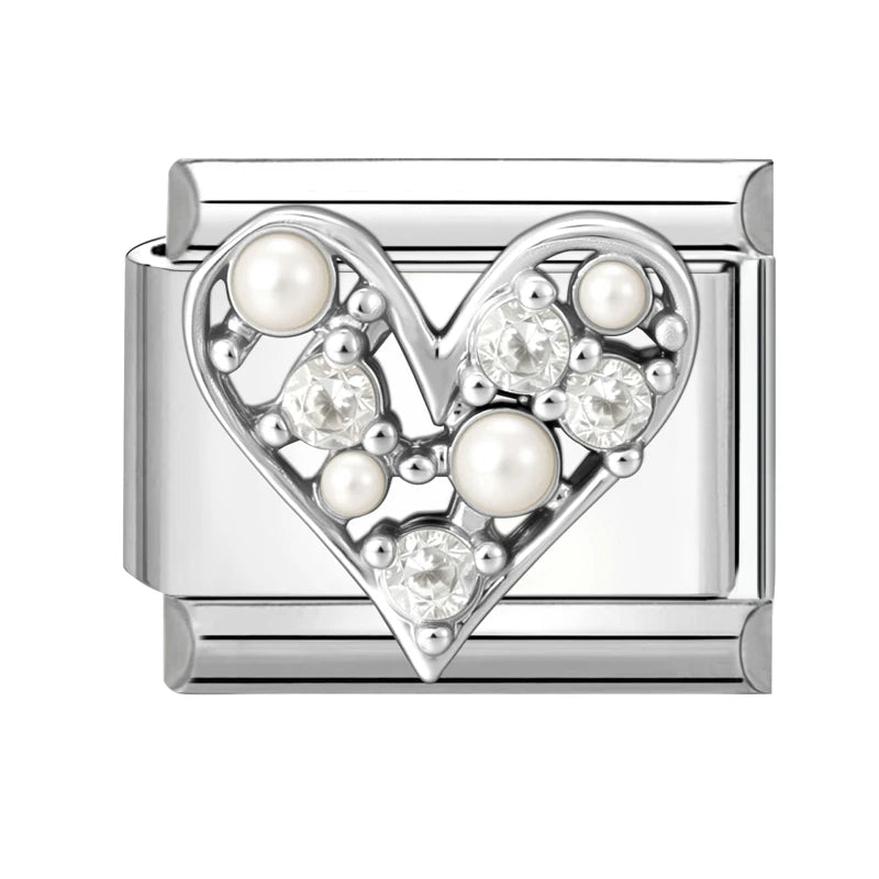 Stříbrný "Charm" z nerezové oceli se srdcem s perlami a kamínky.