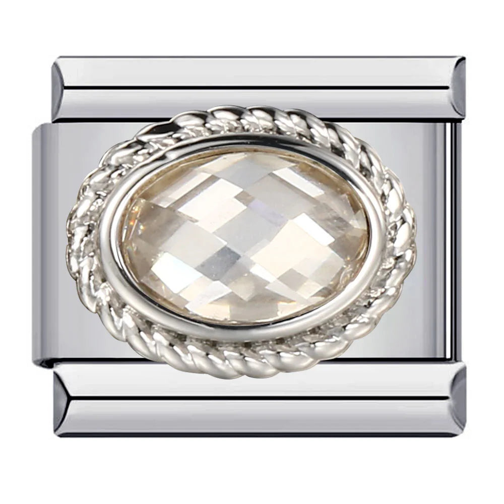 Stříbrný "Charm" z nerezové oceli se světle zlatým gemem.