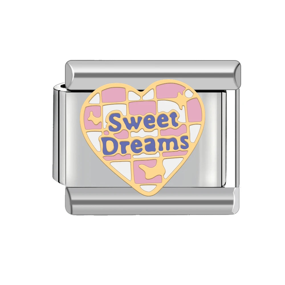 Stříbrný "Charm" z nerezové oceli se srdcem a nápisem Sweet Dreams v růžovo-bílé barvě.