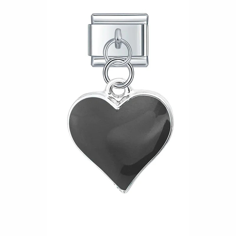 "Charm" z nerezové oceli ve stříbrné barvě s černým visícím srdcem.