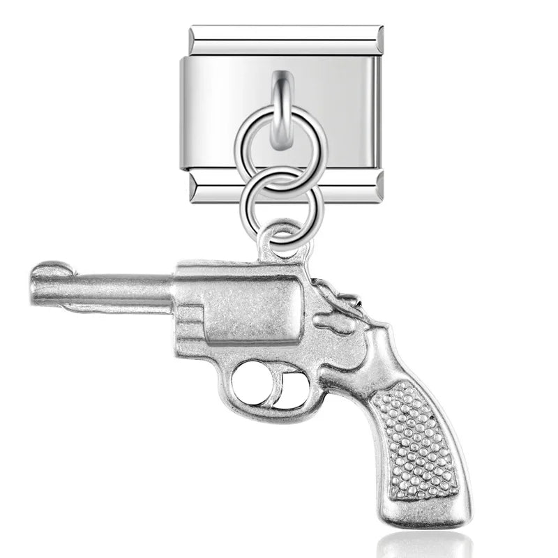 Visící stříbrný "Charm" z nerezové oceli s pistolí.