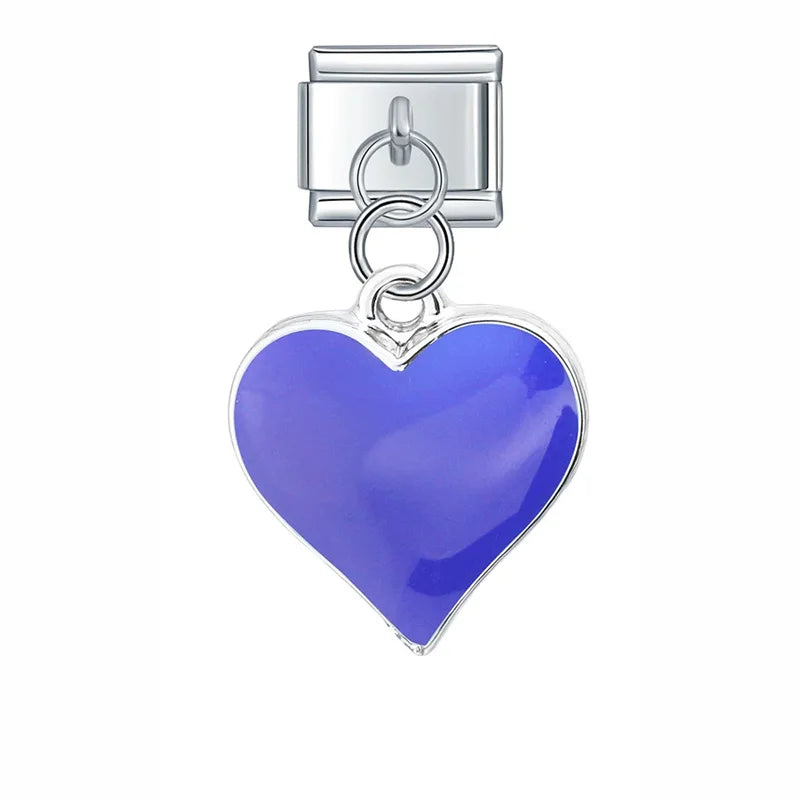 "Charm" z nerezové oceli ve stříbrné barvě s visícím modro fialovým srdcem.