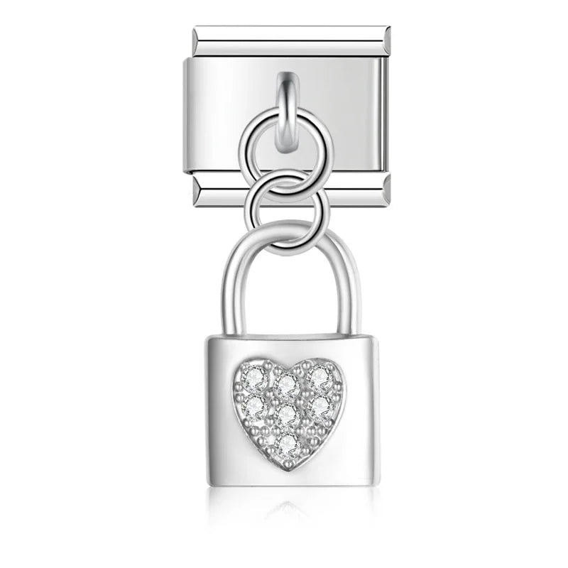 Visící "Charm" z nerezové oceli ve stříbrné barvě se zámkem se srdcem s gemy.