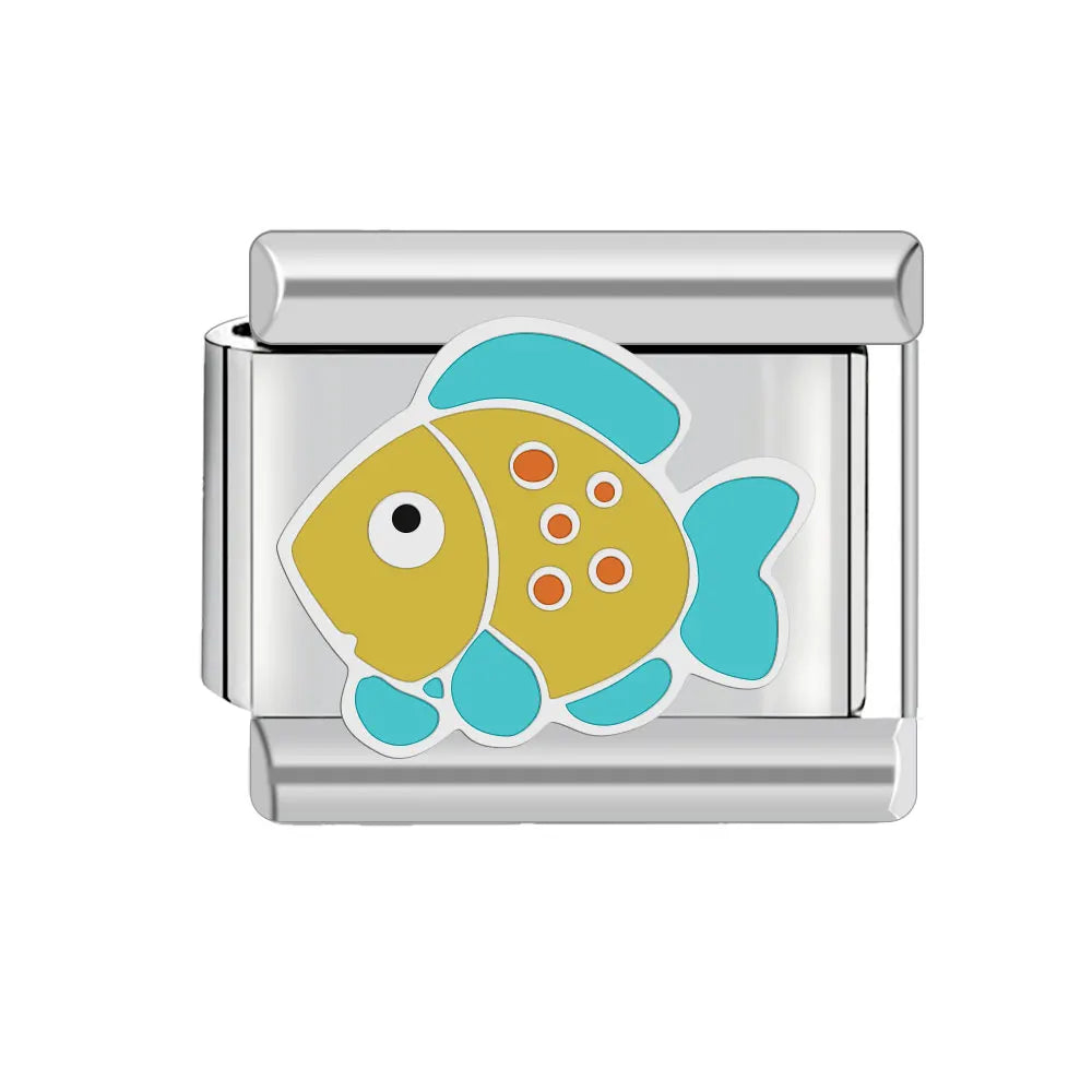 Stříbrný "Charm" z nerezové oceli s žluto-modoru rybkou s puntíky.