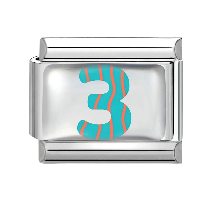 "Charm" z nerezové oceli ve stříbrné barvě se barevným číslem 3 v tyrkysové barvě.