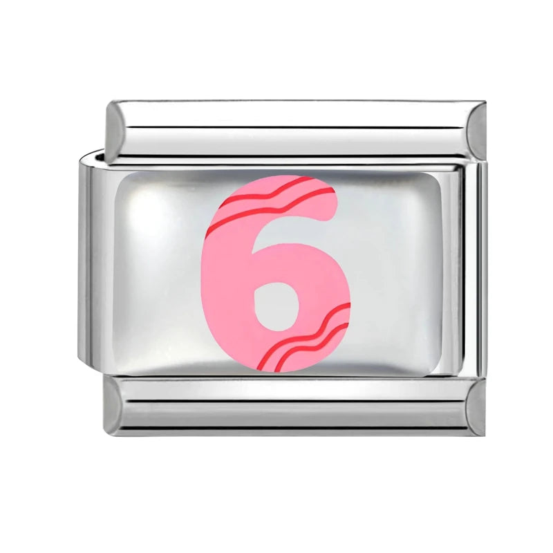 "Charm" z nerezové oceli ve stříbrné barvě se barevným číslem 6 v růžové barvě.