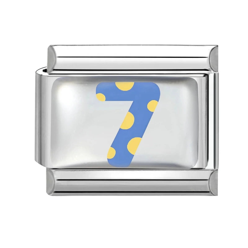 "Charm" z nerezové oceli ve stříbrné barvě se barevným číslem 7 v modré barvě.
