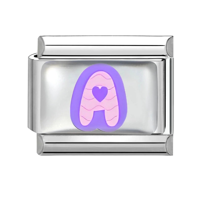 "Charm" z nerezové oceli ve stříbrné barvě se fialovým písmenem A na fialovém pozadí.