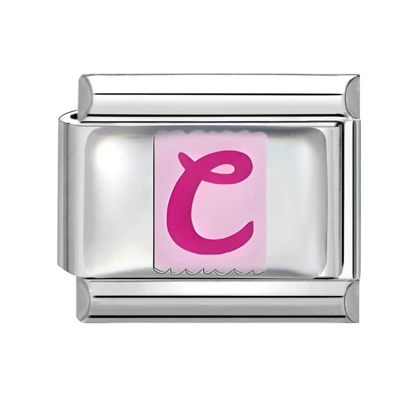 "Charm" z nerezové oceli ve stříbrné barvě se růžovým písmenem C na růžovém pozadí.