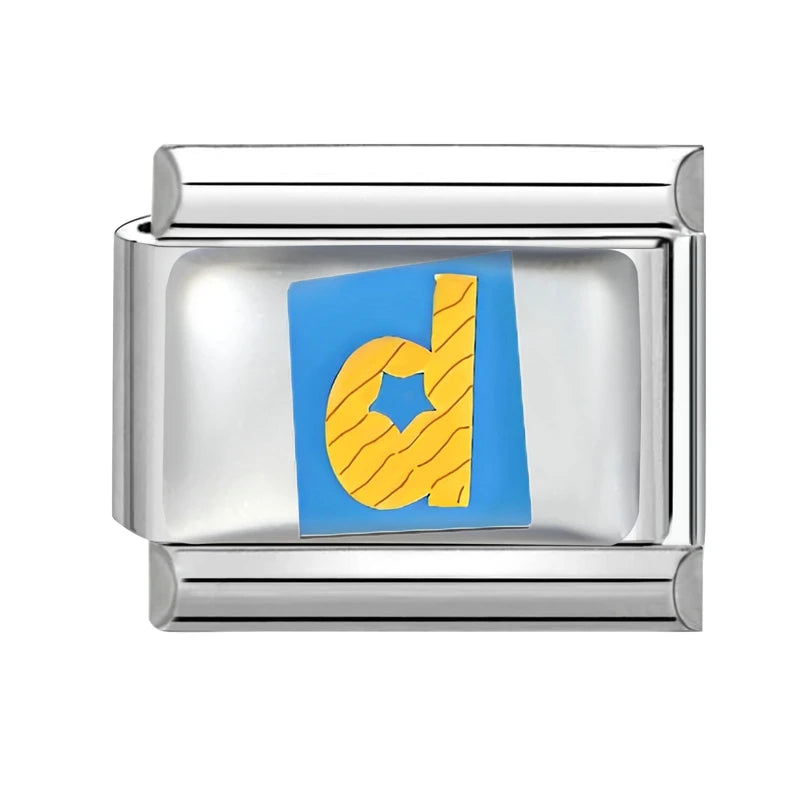 "Charm" z nerezové oceli ve stříbrné barvě se žlutým písmenem d na modrém pozadí.