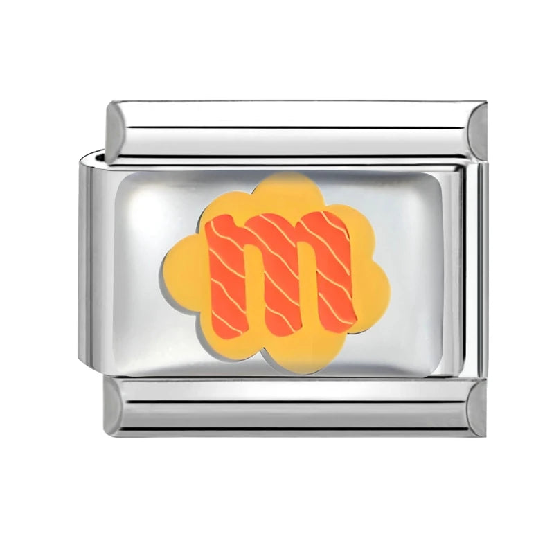 "Charm" z nerezové oceli ve stříbrné barvě se oranžovým písmenem m na žlutém pozadí.