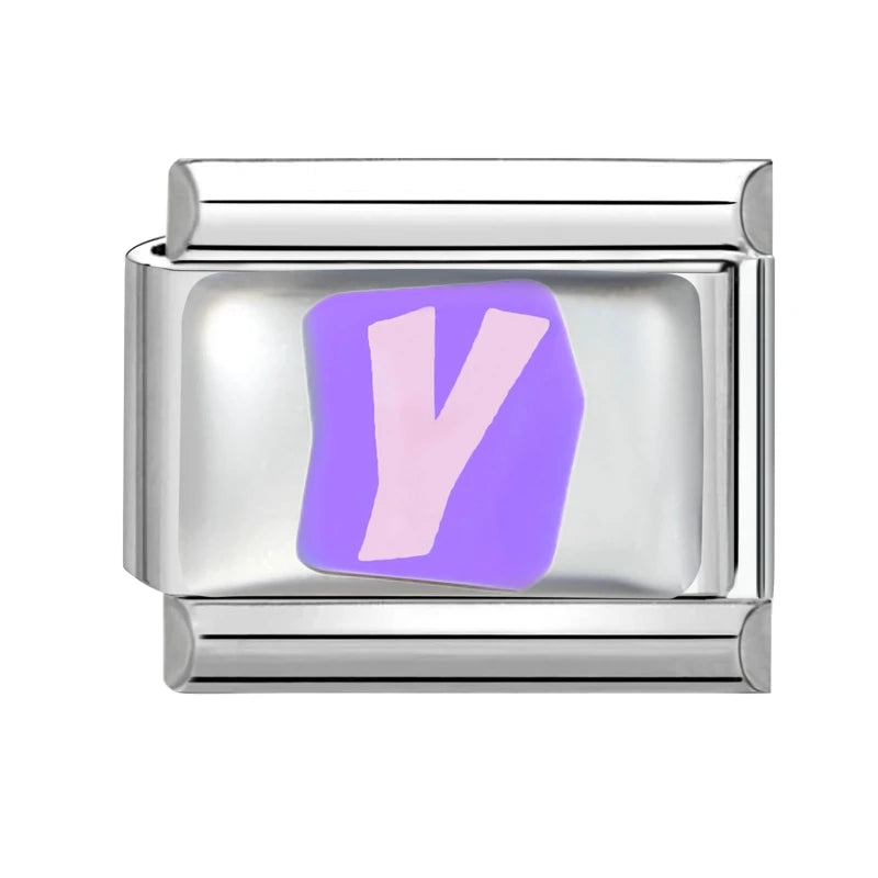 "Charm" z nerezové oceli ve stříbrné barvě se fialovým písmenem Y na fialovém pozadí.