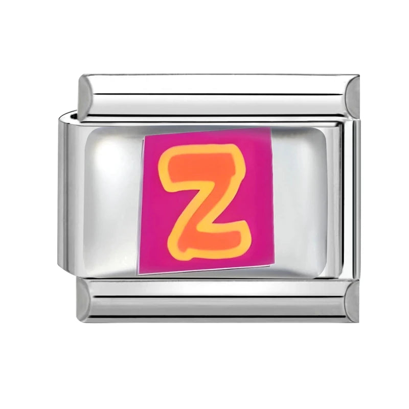 "Charm" z nerezové oceli ve stříbrné barvě se oranžovým písmenem Z na růžovém pozadí.