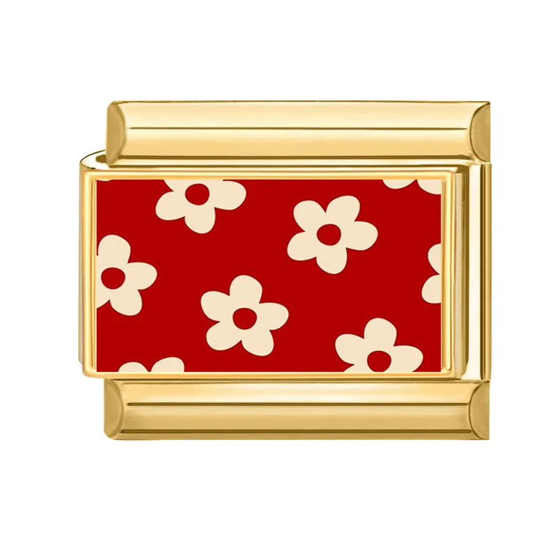 "Charm" z nerezové oceli ve zlaté barvě s béžovými kytkami na rudém pozadí.