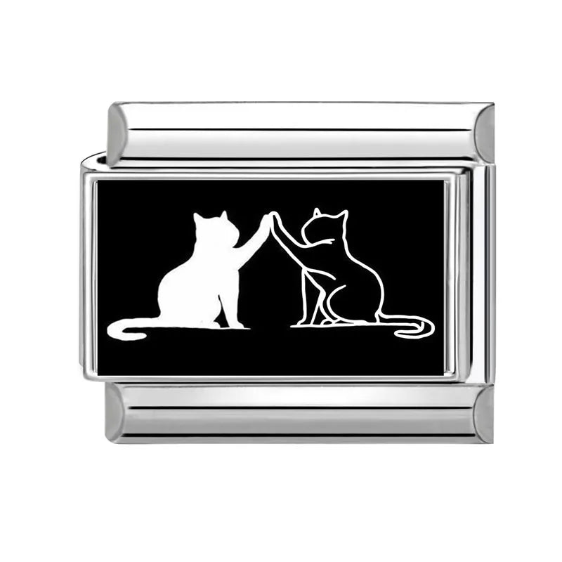"Charm" z nerezové oceli ve stříbrné barvě s bílou a černou kočkou, které si dávají highfive.