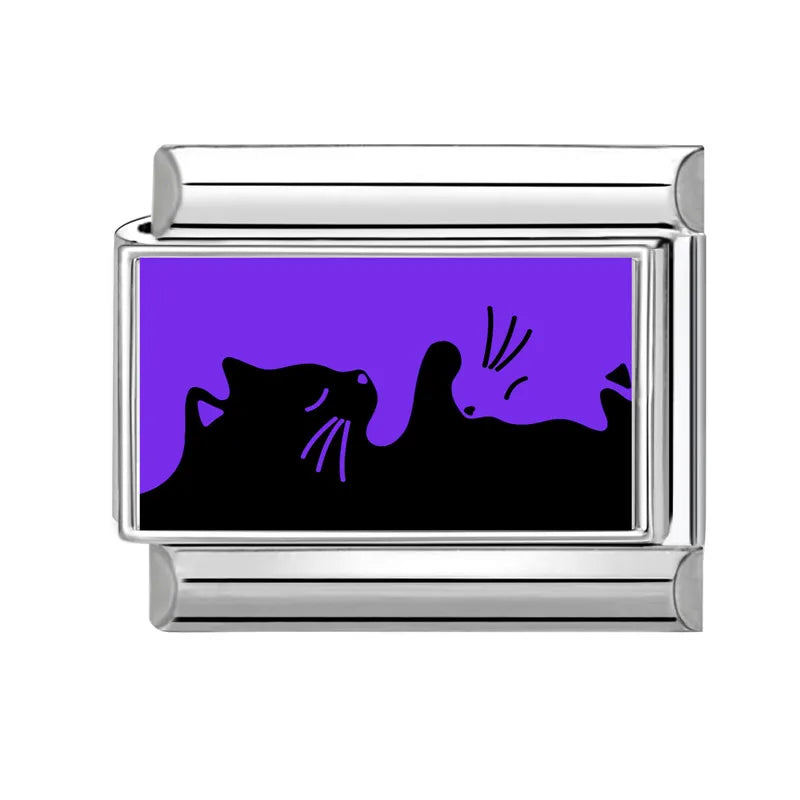 "Charm" z nerezové oceli ve stříbrné barvě s černou kočkou na fialovém pozadí.