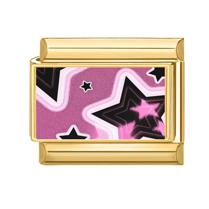 "Charm" z nerezové oceli ve zlaté barvě s černými a růžovými hvězdami v různých velikostech.
