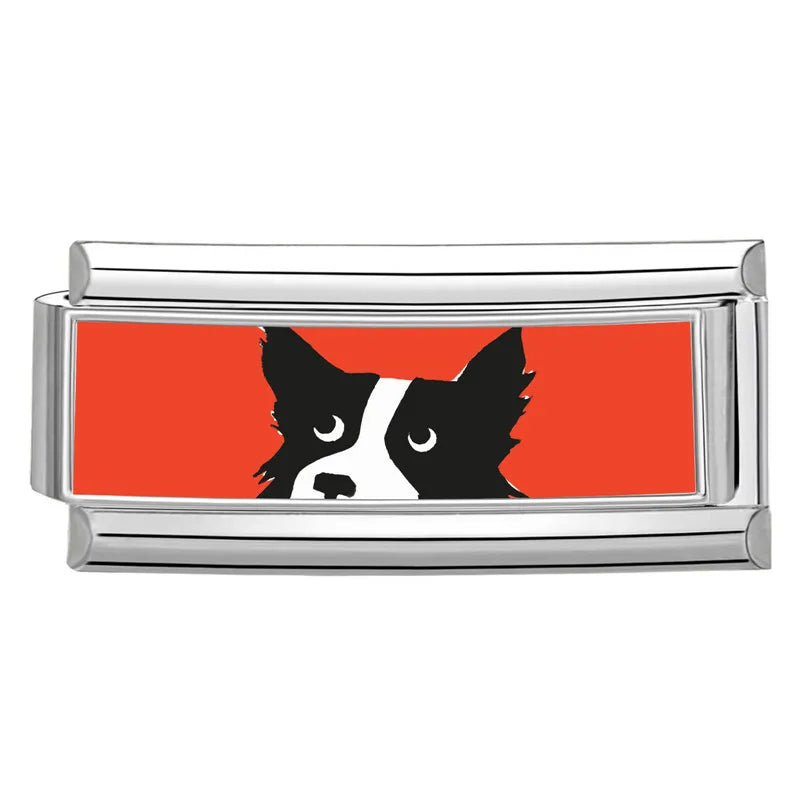 "Double Charm" z nerezové oceli s černo-bílým pes na červeném pozadí.