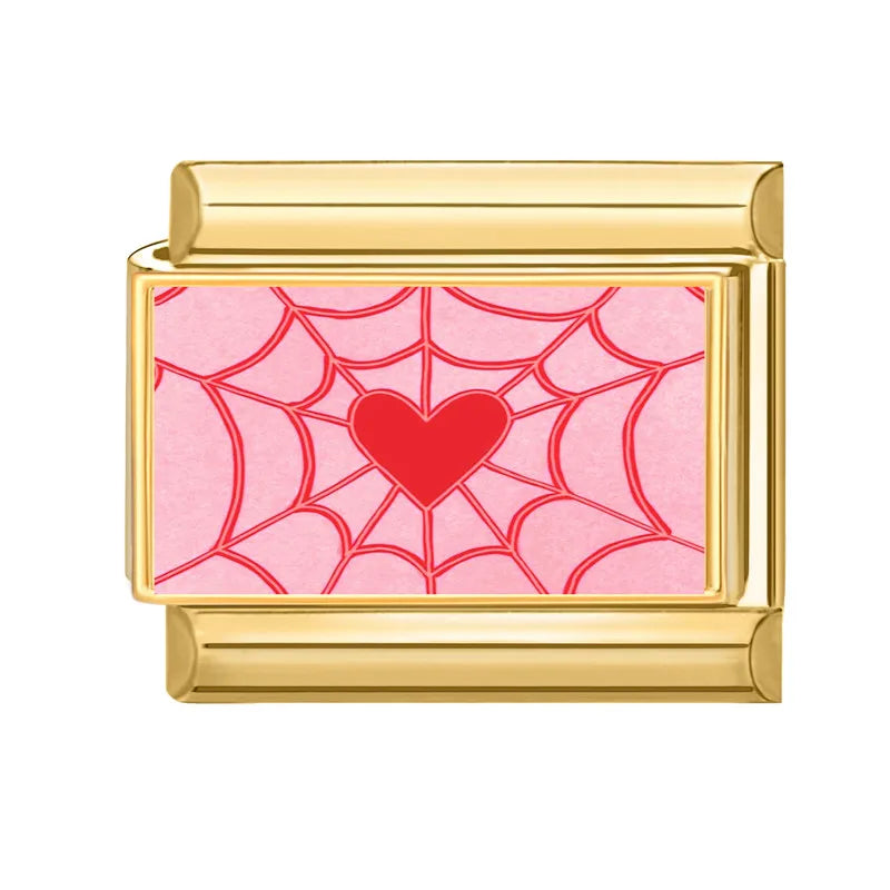"Charm" z nerezové oceli ve zlaté barvě s červenou pavučinou a se srdíčkem.