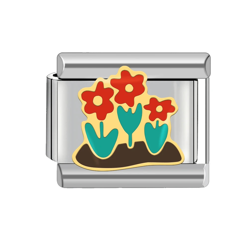 "Charm" z nerezové oceli ve stříbrné barvě s třemi červenými květinami.