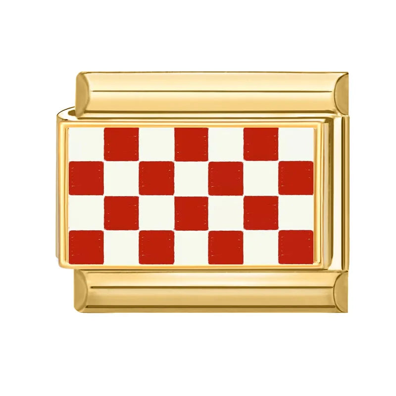"Charm" z nerezové oceli ve zlaté barvě s červeno-bílou šachovnicí.