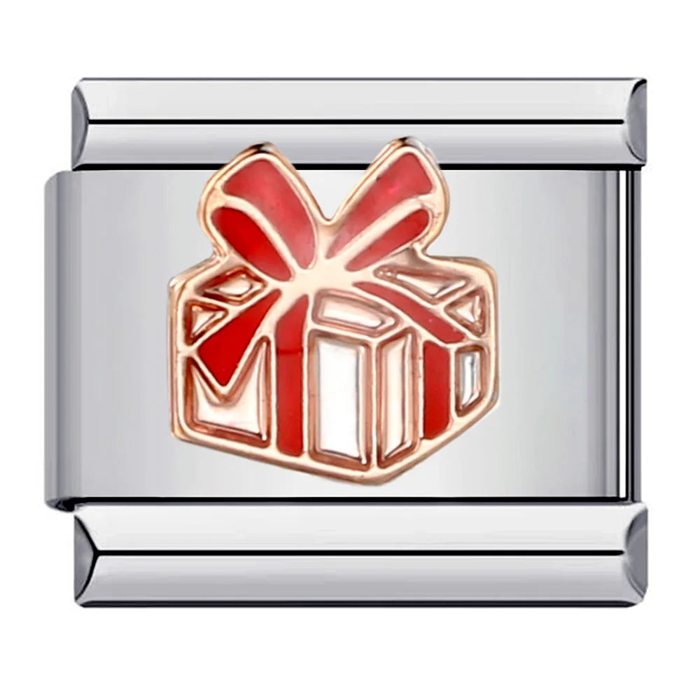 "Charm" z nerezové oceli ve stříbrné barvě s červeno bílým dárkem.
