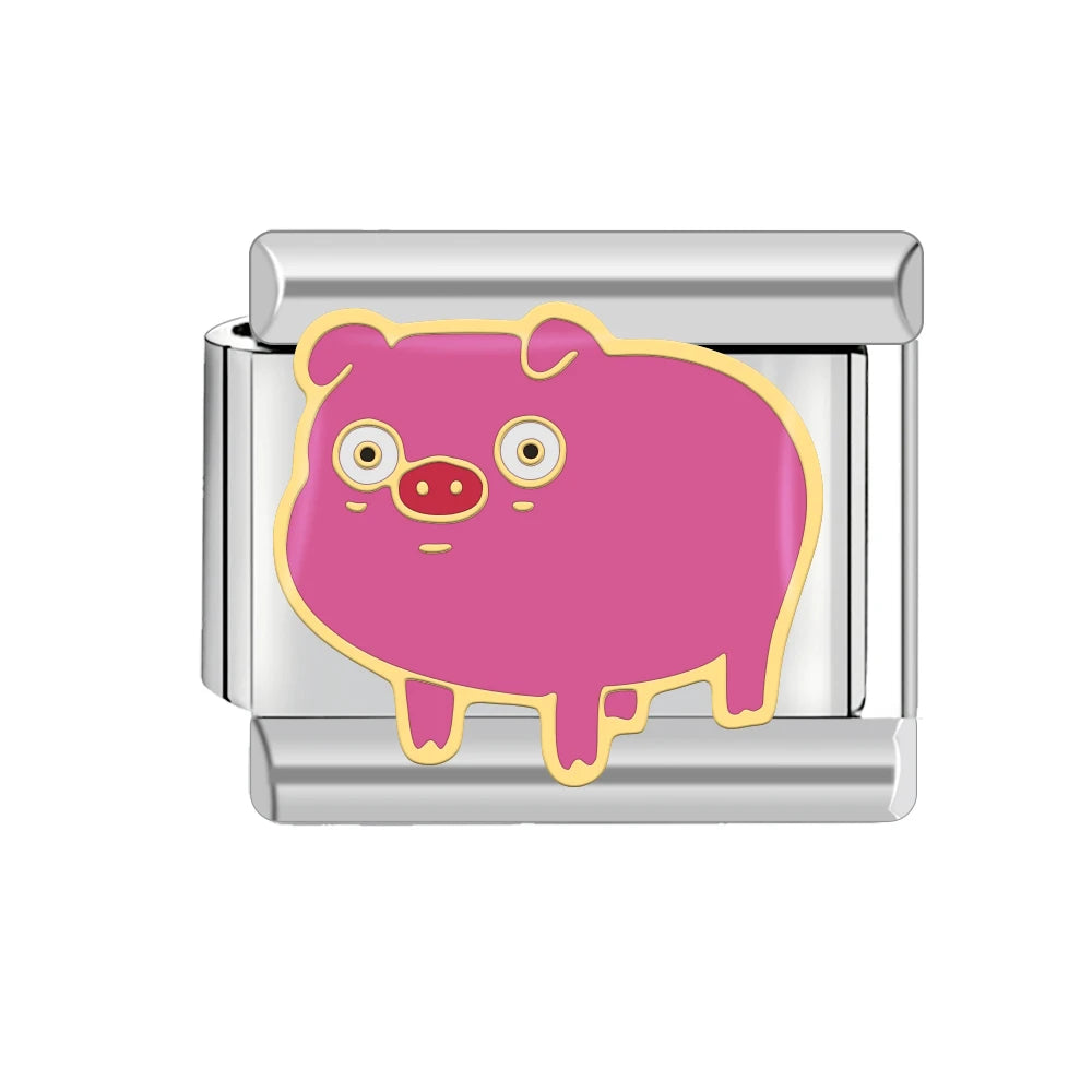 "Charm" z nerezové oceli ve stříbrné barvě s růžovým prasátkem.