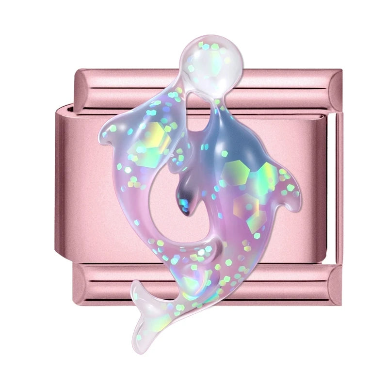 Růžový "Charm" z nerezové oceli s delfíny v holografické barvě.