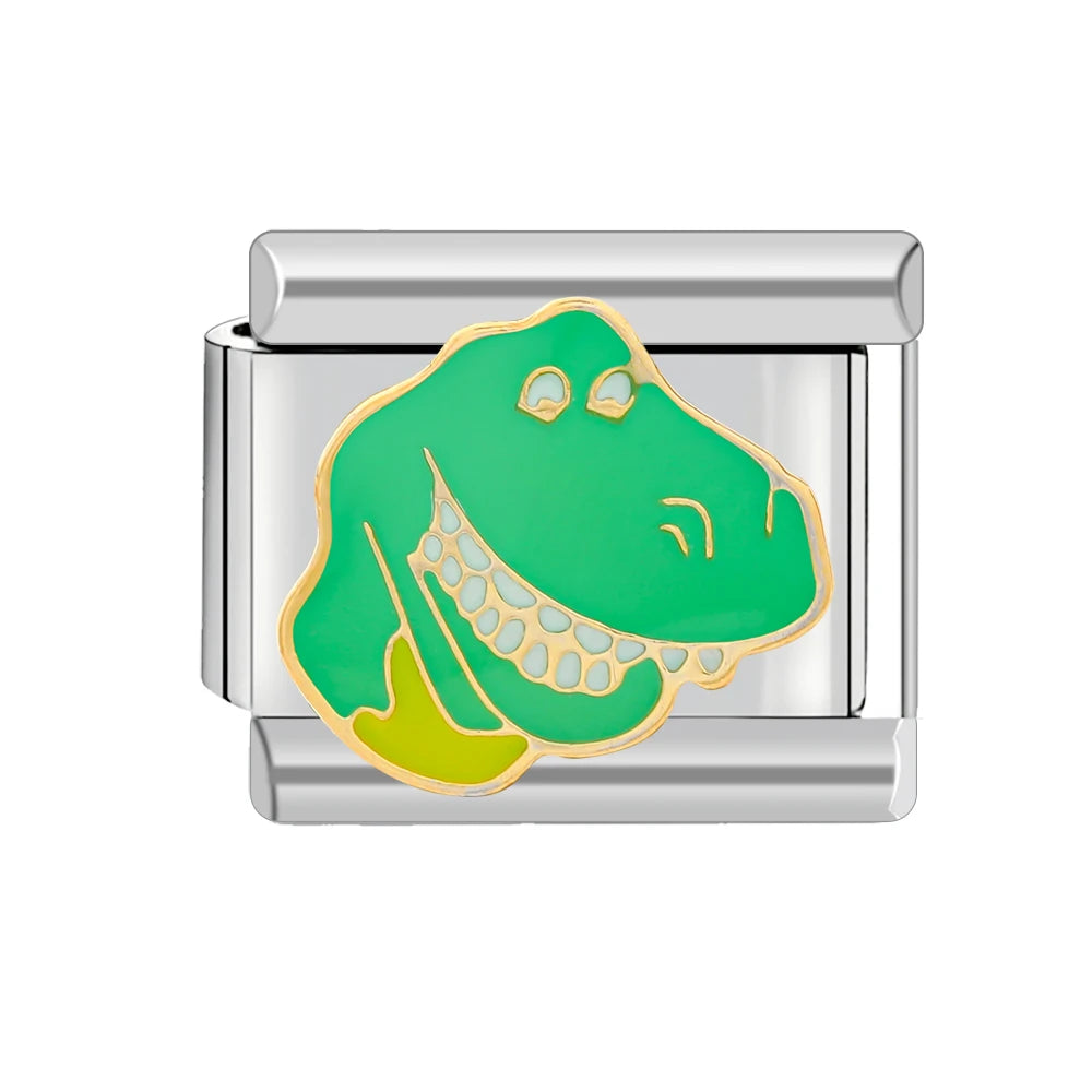Stříbrný "Charm" z nerezové oceli se zeleným dinosaurem.