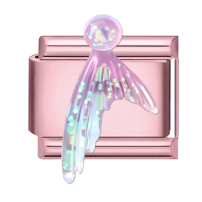 Růžový "Charm" z nerezové oceli s ocasem mořské panny v holografické barvě.