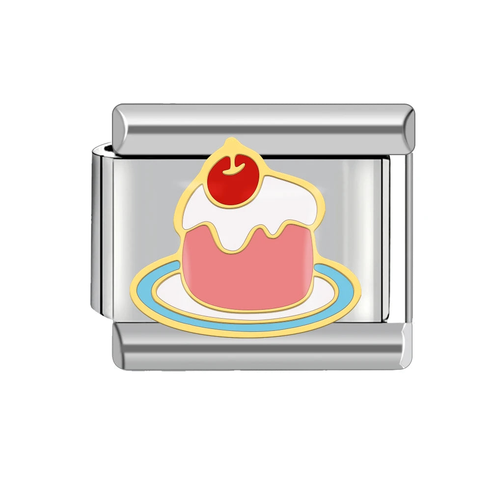 "Charm" z nerezové oceli ve stříbrné barvě s dortem s višní na vrchu.