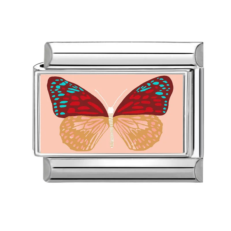 "Charm" z nerezové oceli ve stříbrné barvě s dvoubarevným motýlem.