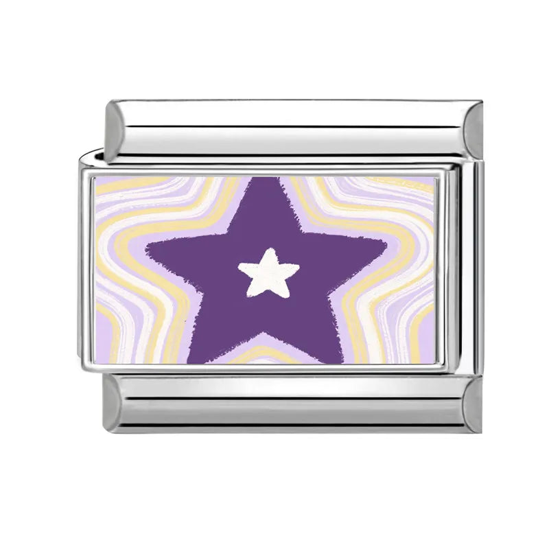 "Charm" z nerezové oceli ve stříbrné barvě s fialovou hvězdou a barevnými vibracemi.