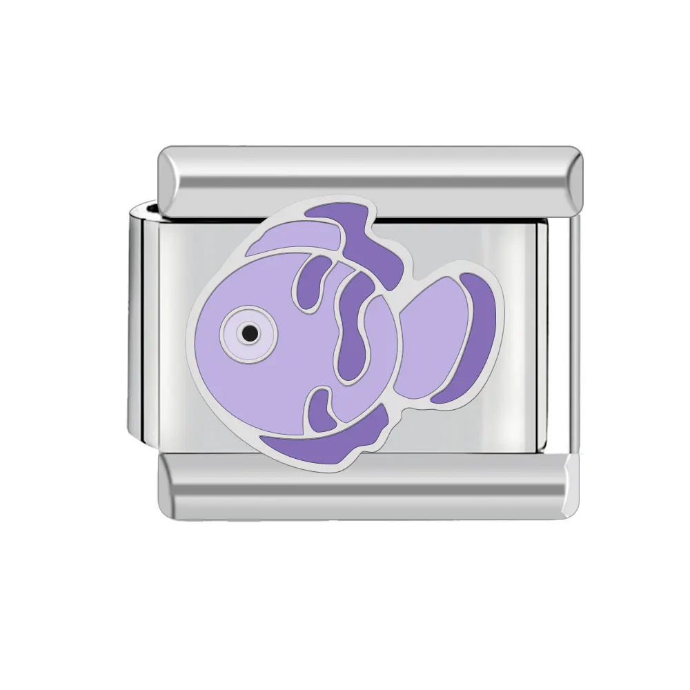 Stříbrný "Charm" z nerezové oceli s fialovou rybkou.